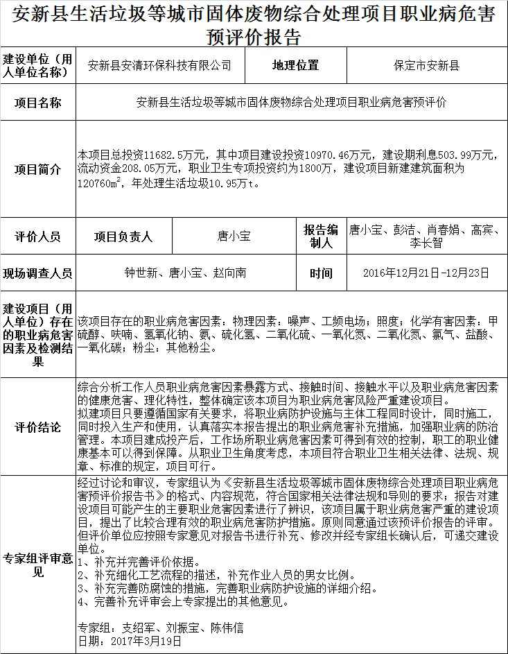 安新县生活垃圾等城市固体废物综合处理项目职业病危害预评价